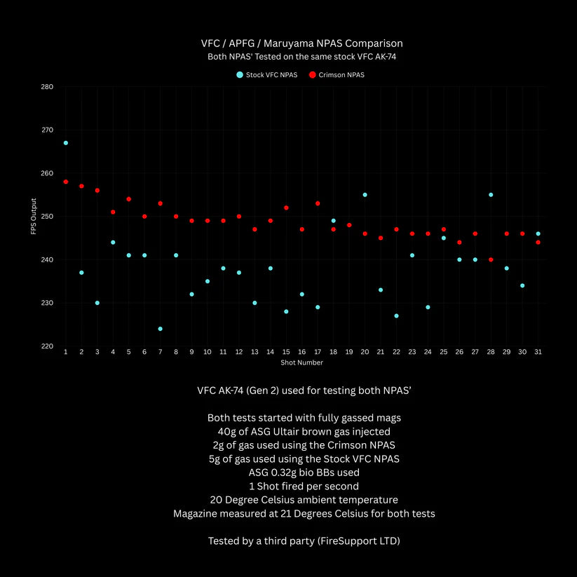 Our design incorporates a tighter internal bore which allows for far more consistent FPS results at the 0.9 - 1.2 joule range, making it ideal for anyone operating within those limits. A graph has been made at the end of our product photos to demonstrate this against the stock valve. This clearly shows just how consistent then Crimson NPAS truly is. A gamechanger for such a small cost.